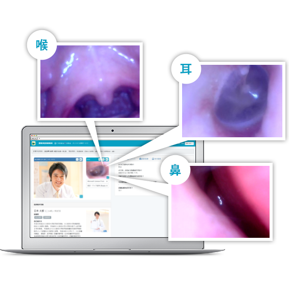 市販の外部カメラ(耳かきカメラ等)も使うことができ、耳・鼻・口の中などの映像を共有しながらオンライン診療が可能となります。
